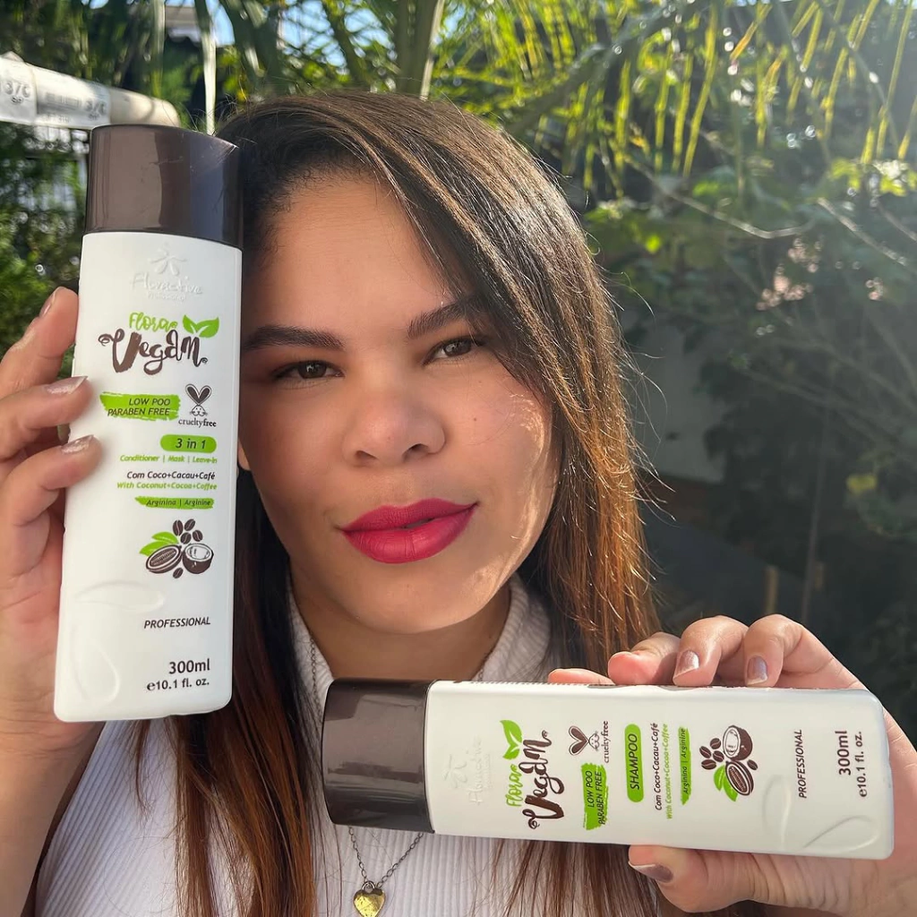 Transforme sua rotina capilar com o Kit Flora Vegan e experimente cabelos naturalmente lisos, hidratados e livres de frizz, com um toque de sustentabilidade.